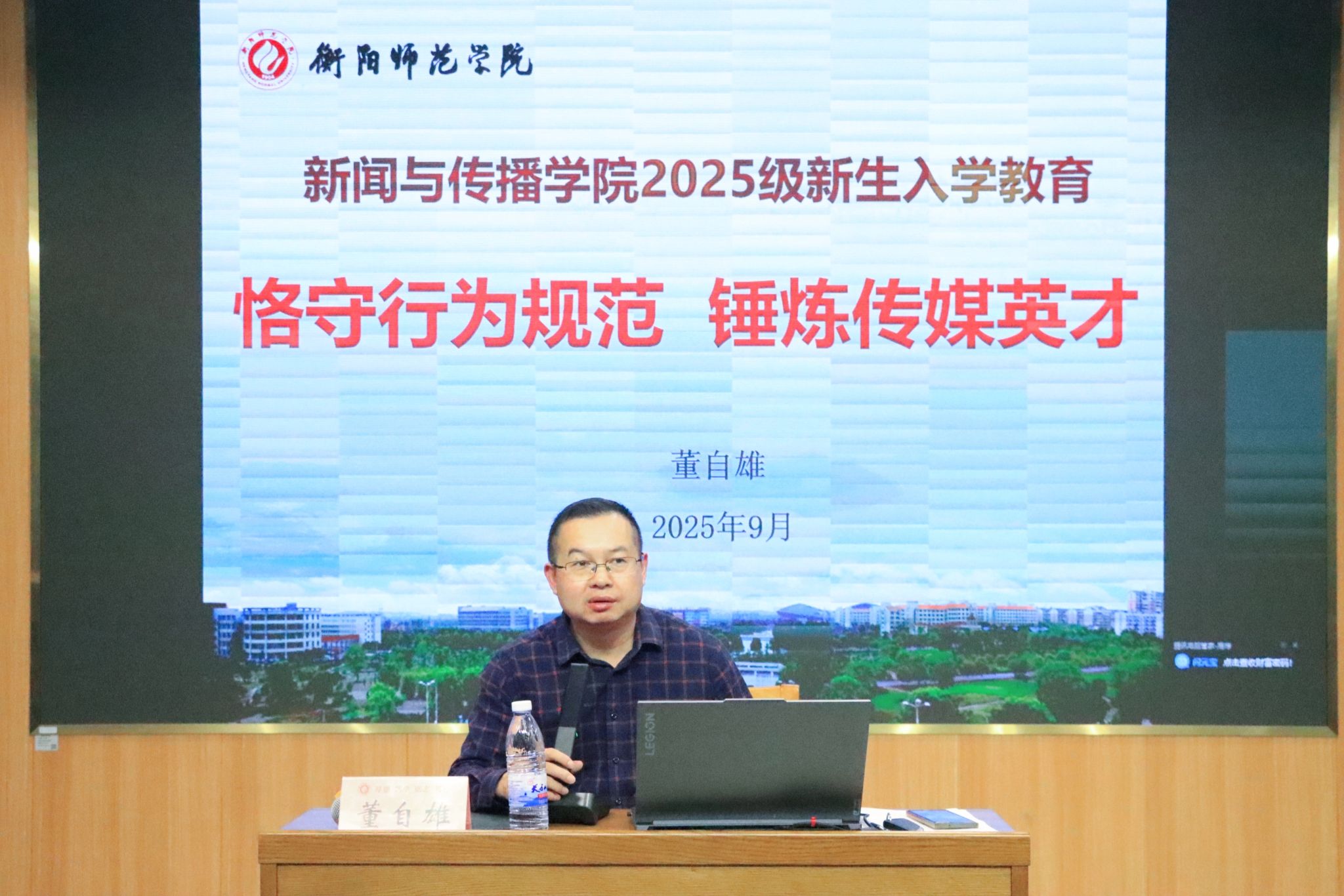 9月23日,菠菜担保网2025级新生入学讲座在仁智楼A107演播厅举行。菠菜担保网党总支副书记董自雄担任主讲人,2025级全体新生到场聆听。