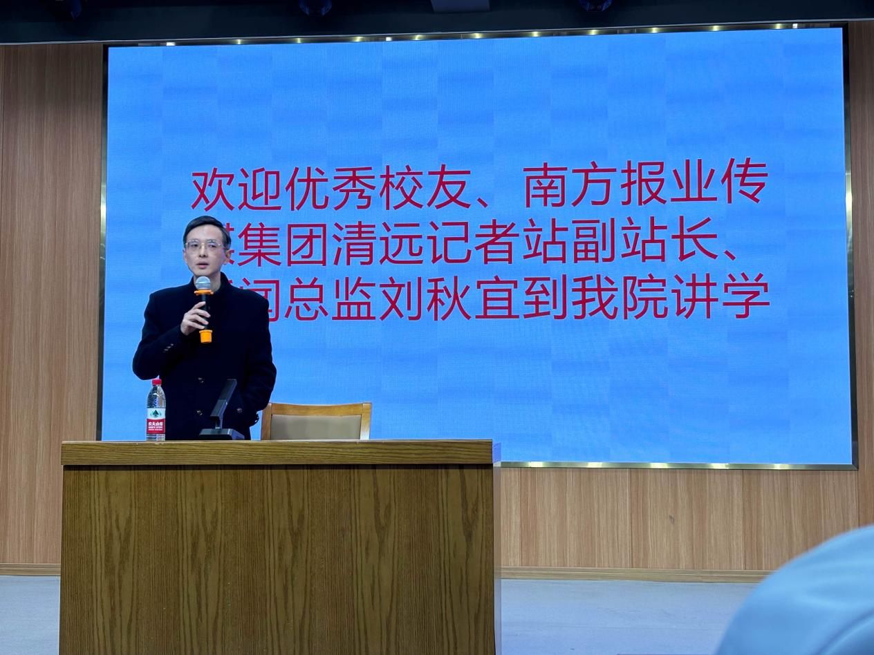 12月9日上午,菠菜担保网在仁智楼A107演播厅开展《“南方的打法”——融媒体转型的方法论与实战案例》主题讲座。我校优秀校友、南方报业传媒集团清远记者站副站长兼新闻总监刘秋宜受邀主讲。菠菜担保网副院长邓庄,辅导员封伟为出席。本次活动吸引了百余位新闻传播类专业学生到场聆听。