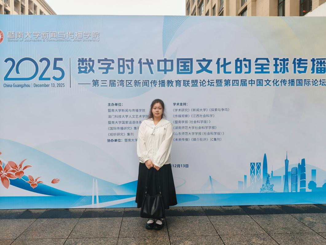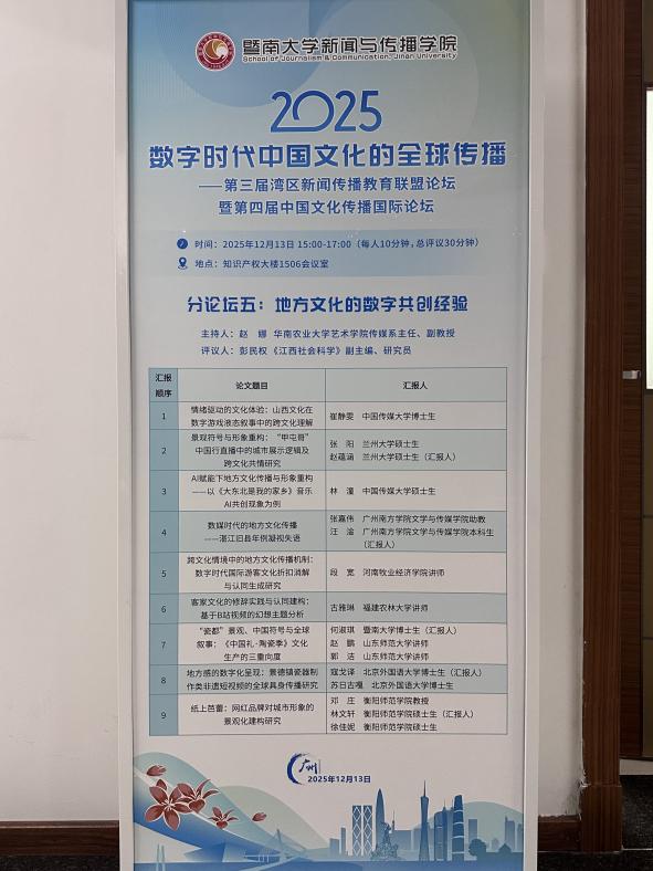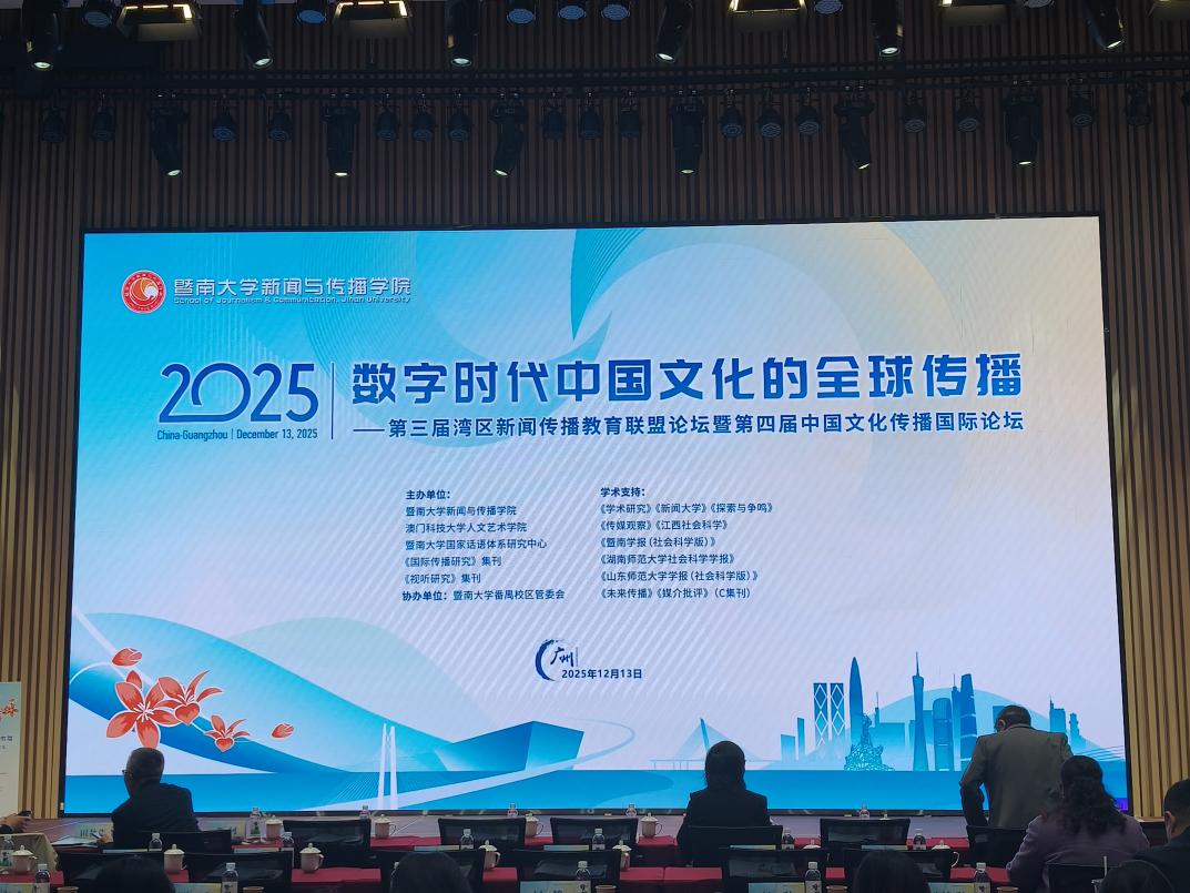 2025年12月13日,由暨南大学菠菜担保网、暨南大学国家话语体系研究中心、《视听传播》集刊、《国际传播研究》集刊主办的“第三届湾区新闻传播教育联盟论坛暨第四届中国文化传播国际论坛”在广州成功举行。本届论坛主题为“数字时代中国文化的全球传播”,来自全国多所高校及研究机构的专家学者、青年学子与会。我院邓庄教授及其指导的硕士研究生林文轩、徐佳妮受邀参加此次论坛,并在会上进行学术成果展示与交流。